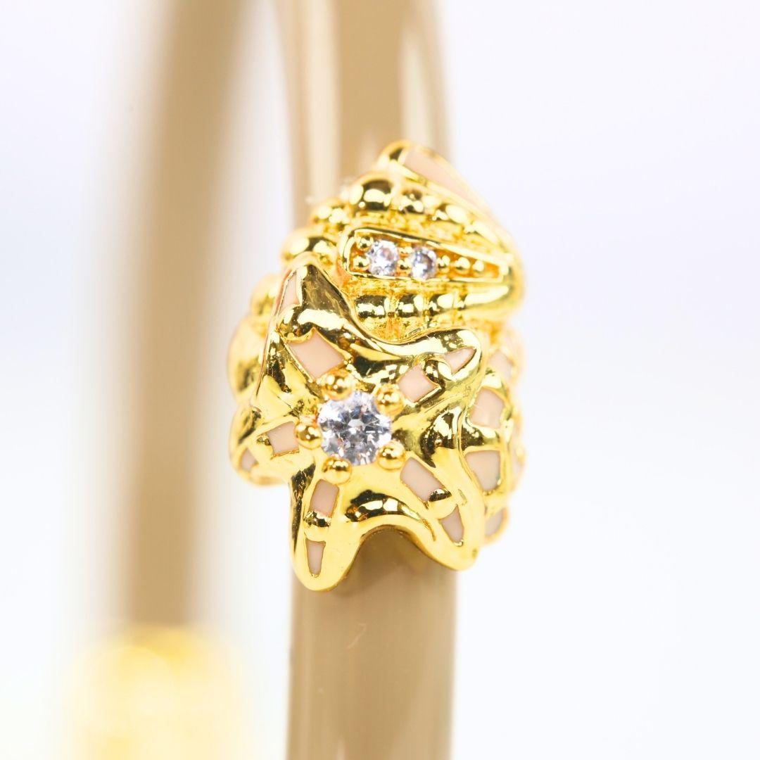 A sculpted shell form, crafted from gold-plated brass, glows with clear crystals and warm sand-hued enamel, capturing the essence of coastal elegance. This radiant centerpiece is paired with our signature sand tubing, a serene and timeless addition to any collection.