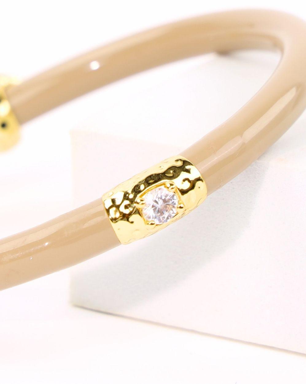 Tragen Sie die Gelassenheit der Küste mit unserem Sand Shell All Weather Bangle. Dieses elegante Stück verfügt über einen vergoldeten Muschel-Anhänger, der mit einem weichen, sandfarbenen Emaille-Finish und schimmernden Kristallen verziert ist. Als Symbol für Schutz und Intuition ist dieses wasserdichte und geräuschlose Armband eine wunderschöne, handgefertigte Erinnerung an die stille Weisheit des Ozeans. Perfekt zum Stapeln oder allein getragen als Talisman natürlicher Schönheit.