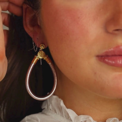 Esculpidos en una silueta atemporal de lágrima y disponibles en tonos radiantes, estos Pendientes Todo Clima Champagne son livianos, silenciosos e impermeables—diseñados para acompañarte desde la meditación matutina hasta las celebraciones nocturnas. Una luminosa cuenta con el logo chapada en oro corona cada pieza, reflejando el acabado característico de nuestras queridas pulseras.