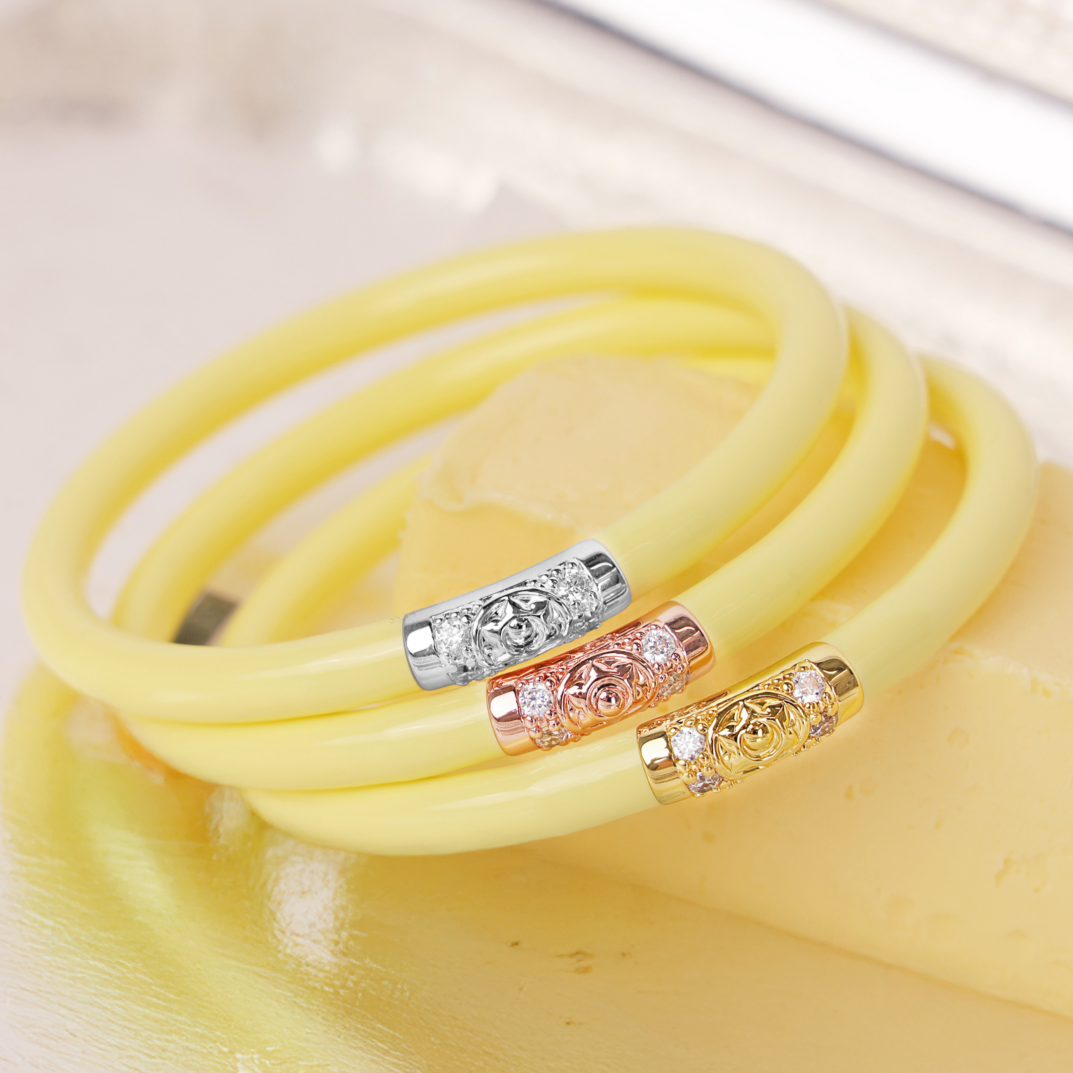 Llegando como la primera luz de la mañana, el Butter Three Kings AWB® captura el cálido resplandor del sol de la primavera temprana. Estas pulseras lisas y brillantes tienen un tono dorado suave que recuerda a la mantequilla recién batida reposando sobre porcelana cálida, ofreciendo un matiz que se siente tanto nostálgico como completamente actual.