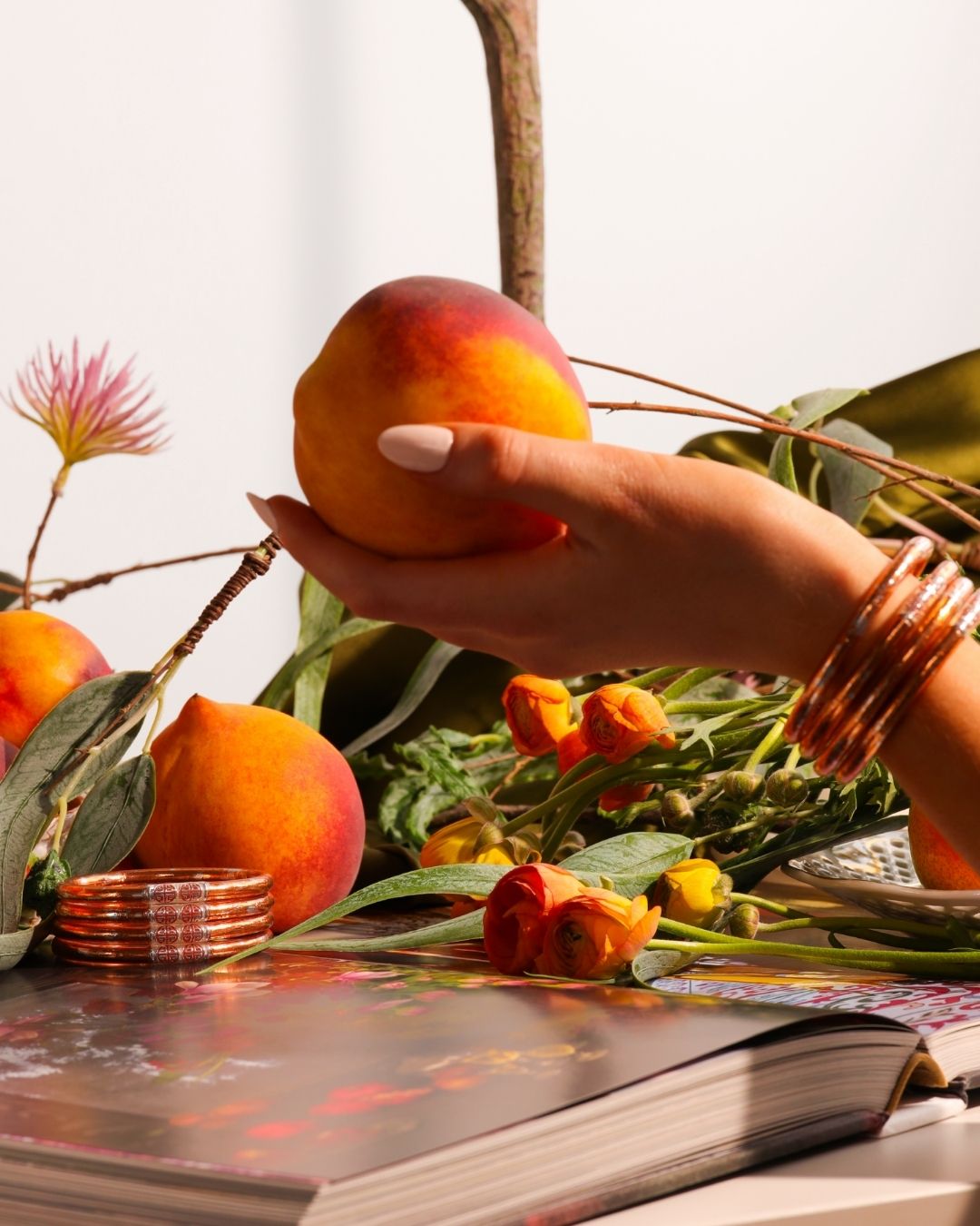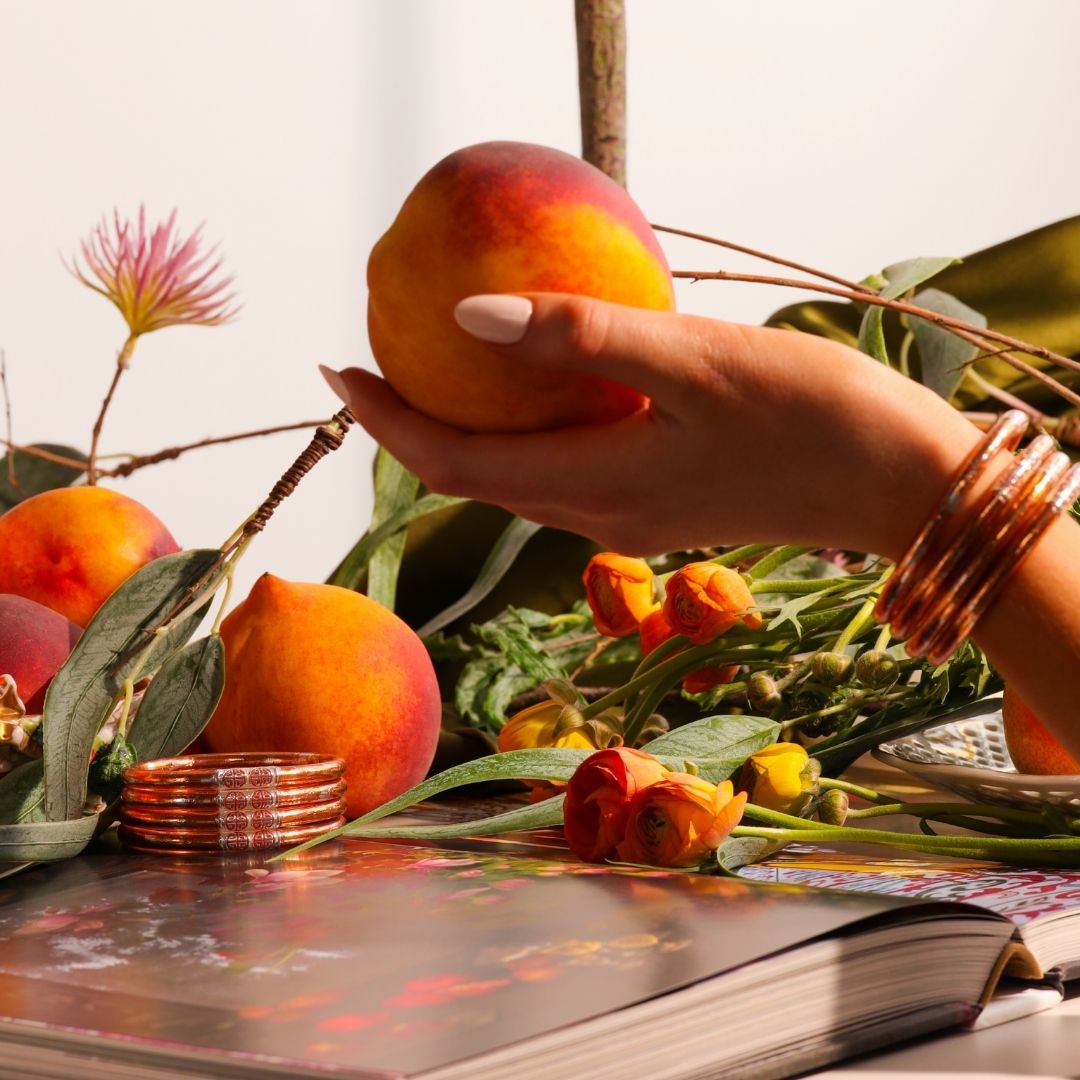 KOI Pêche All Weather Bangles® are a luminous tribute to nature’s fleeting grace—a mindful embrace of warmth, elegance, and inner serenity. This delicate hue, kissed with soft notes of sun-ripened peach and petal-pink undertones, whispers of early morning light, orchard breezes, and the quiet joy of stillness.
