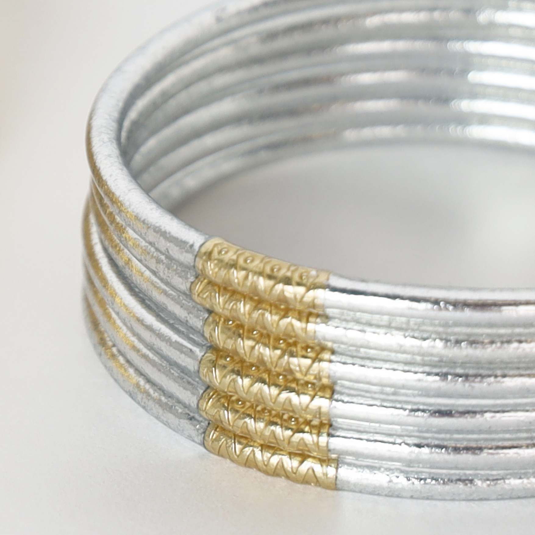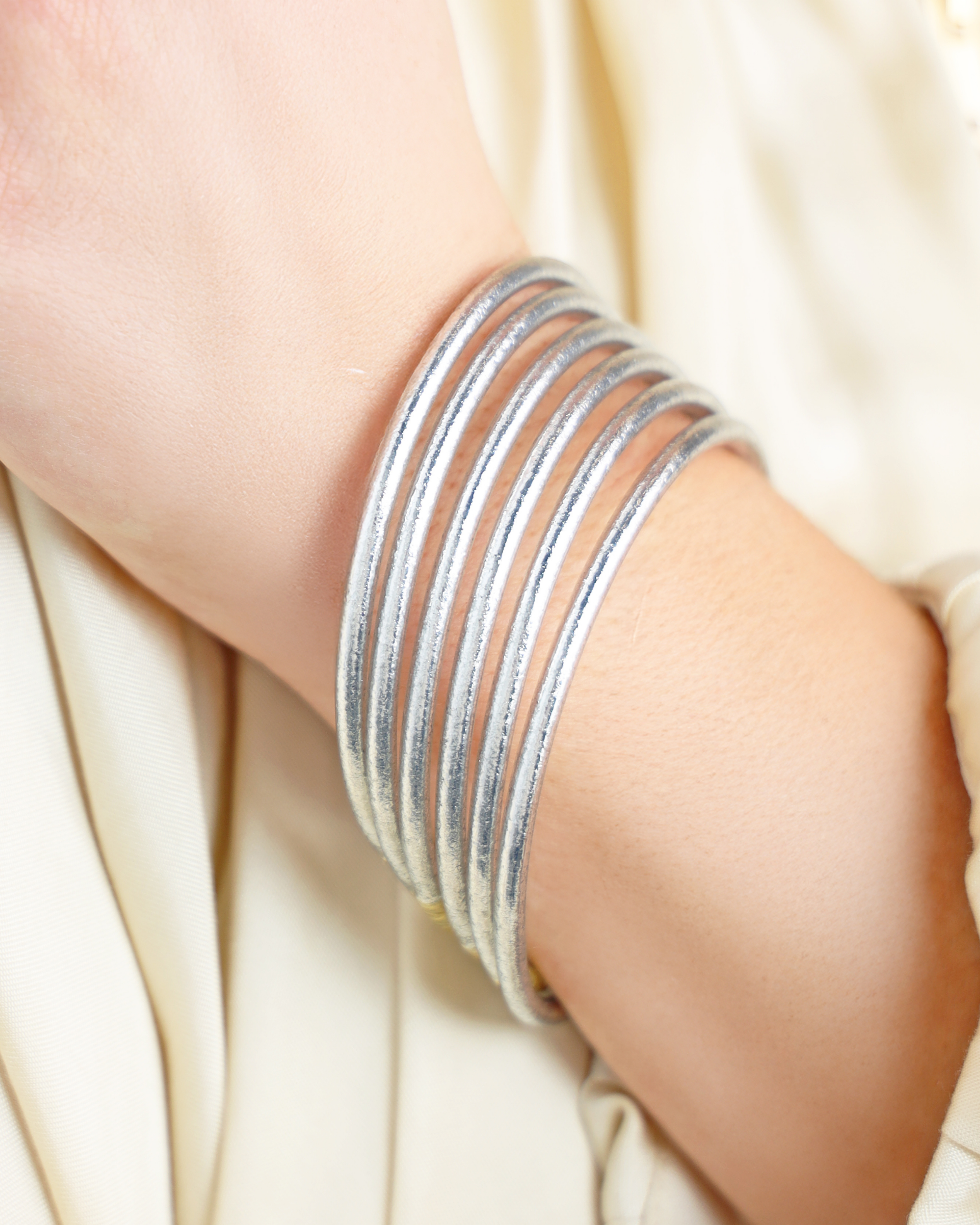A cool, radiant silver that captures light with effortless grace. Silver Lumine is delicate yet powerful—thin bangles that shimmer like liquid silk against the skin. Refined and fluid, each piece layers with intention, creating a soft glow that feels both modern and timeless.